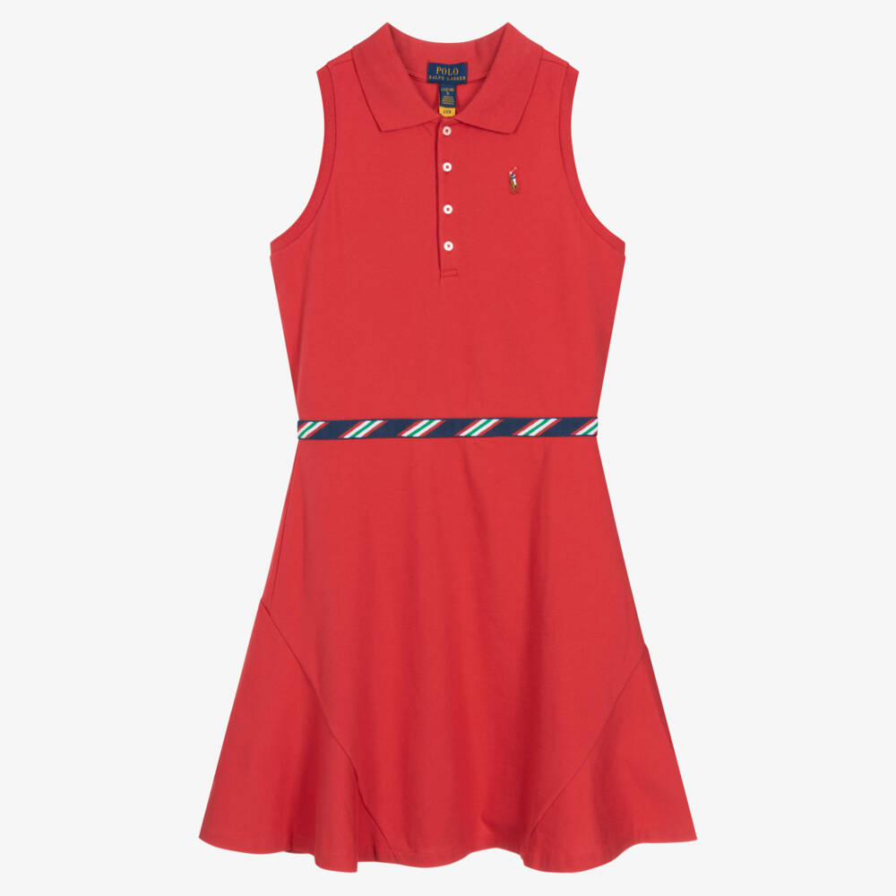 Red sleeveless polo dress for teen girls by Ralph Lauren, made in soft cotton piqué with a classic ribbed collar. The waist is accentuated with a red, blue and green striped web belt, creating an on-trend fit and flare shape. For a designer finish, the signature pony logo is embroidered on the chest and the dress fastens with branded buttons.