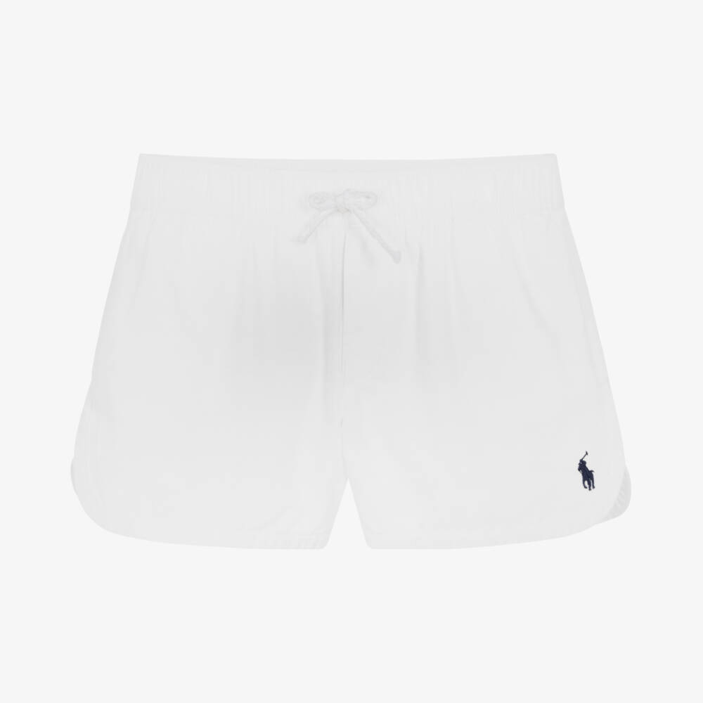 Sporty white shorts for teen girls by Ralph Lauren, made in comfortable cotton twill. They have an elasticated waist for easy pull on, with a faux drawstring tie. For a signature look, the brand's small pony logo is embroidered on one leg in navy blue.