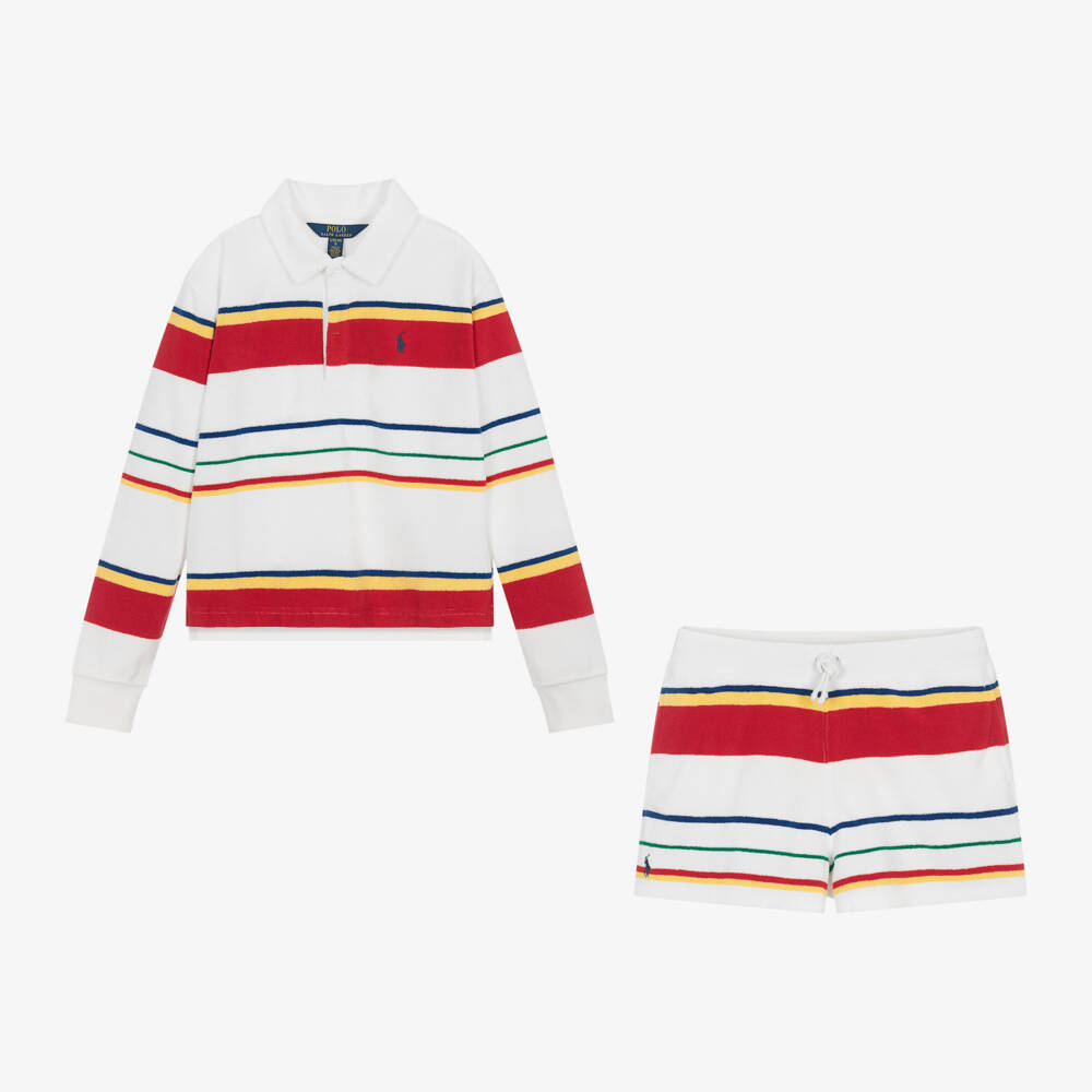 Teen girls can achieve a sporty look with this white cotton shorts set by American brand Ralph Lauren. Made in comfortable towelling with colourful stripes, both pieces have the label's signature pony logo embroidered in blue by the hemline. The long-sleeved, rugby-style shirt has button fastenings on the covered placket and ribbed cuffs. The matching shorts have a drawstring for a comfortable fit and useful, concealed side pockets.