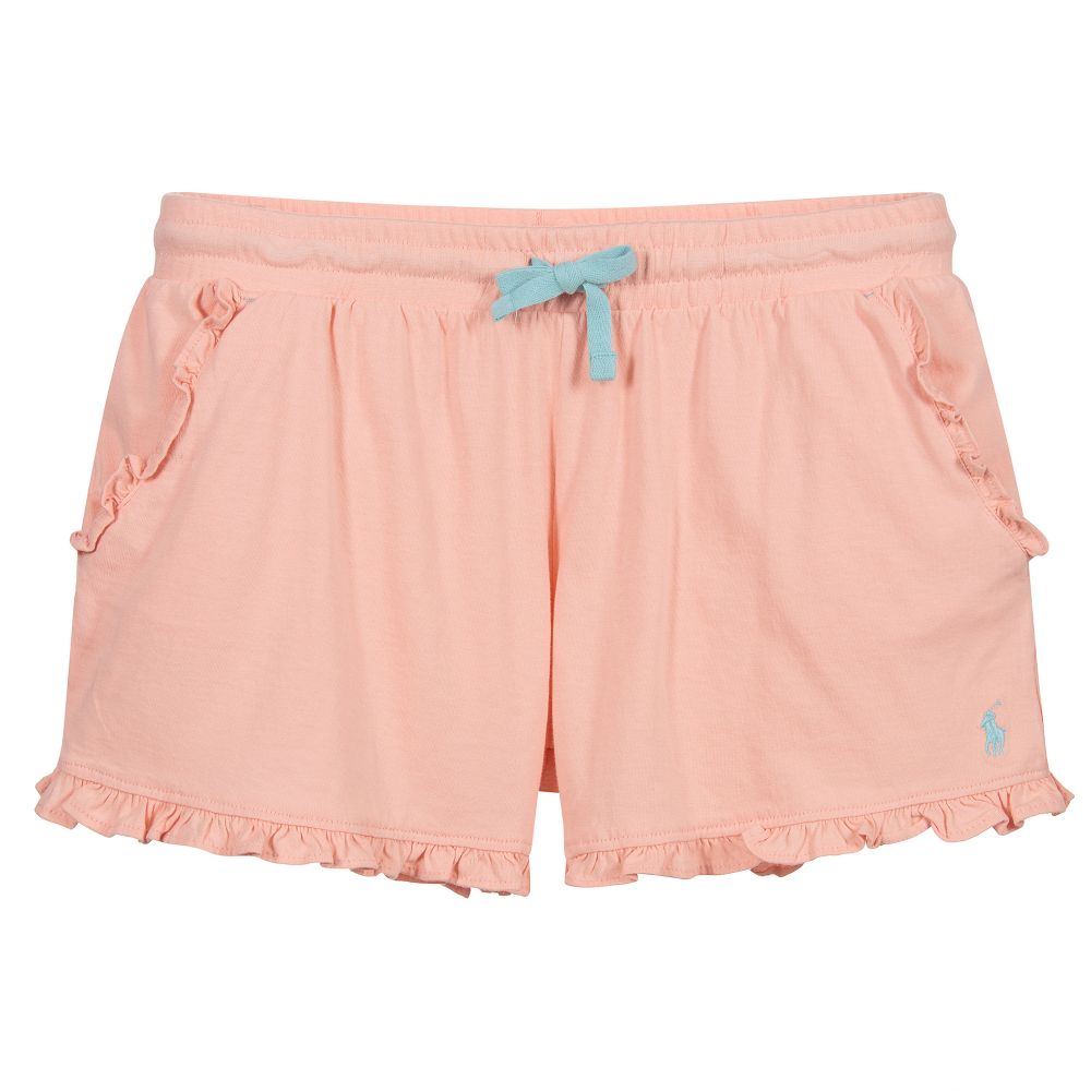 Pink shorts for teen girls by by Polo Ralph Lauren, with blue signature pony logo embroidery. The pastel hues and ruffle trim create a romantic feel and the soft cotton jersey ensures maximum comfort. They have four pockets and a drawstring waist with blue ties.