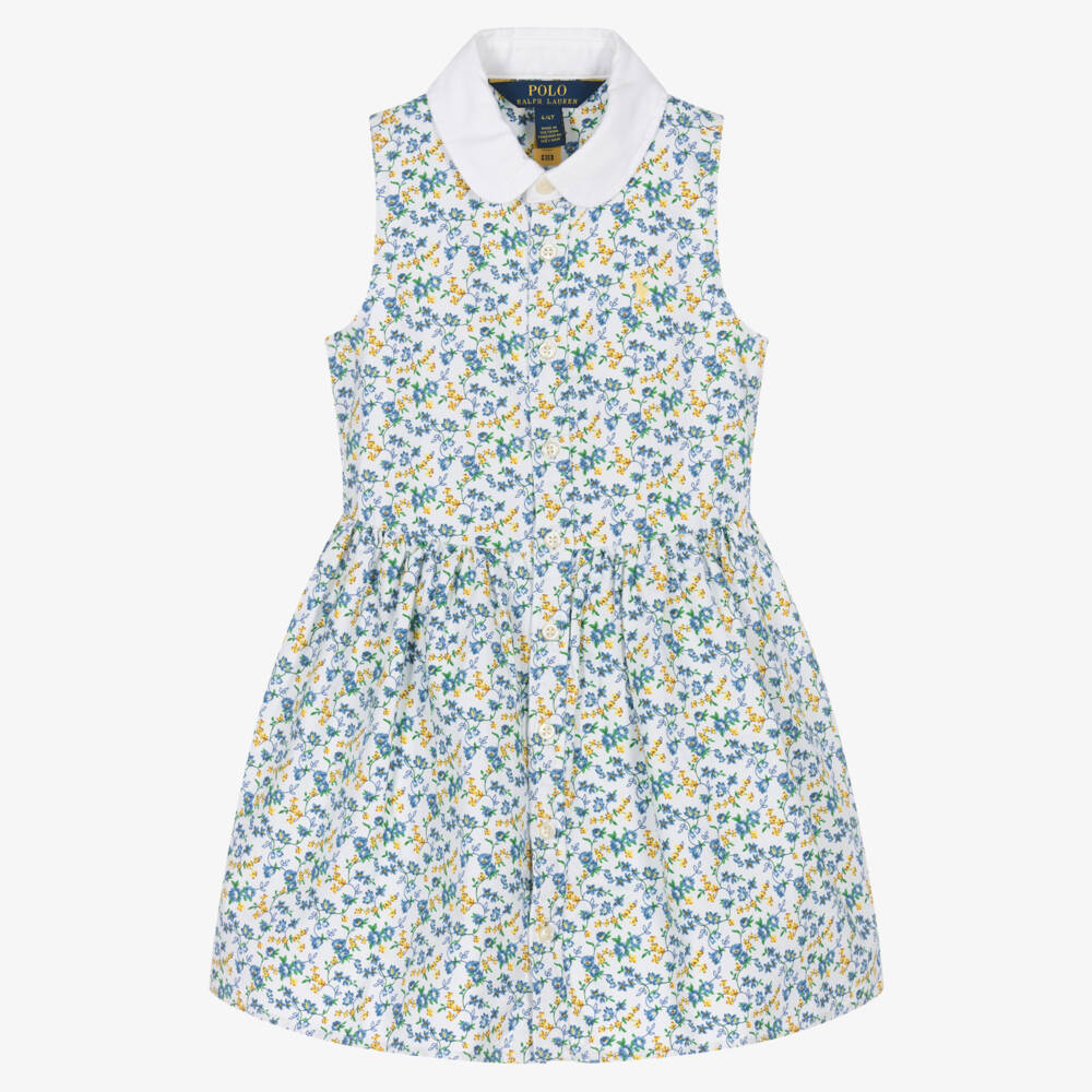 Lovely white ditsy floral dress for girls from Ralph Lauren, with a nostalgic blue, yellow and green flower pattern. Ideal for warmer days, this sleeveless design is woven in soft Oxford cotton, with beautiful pearlescent front buttons. It has a pale yellow embroidered pony logo on the bodice and a gathered skirt with concealed side pockets.