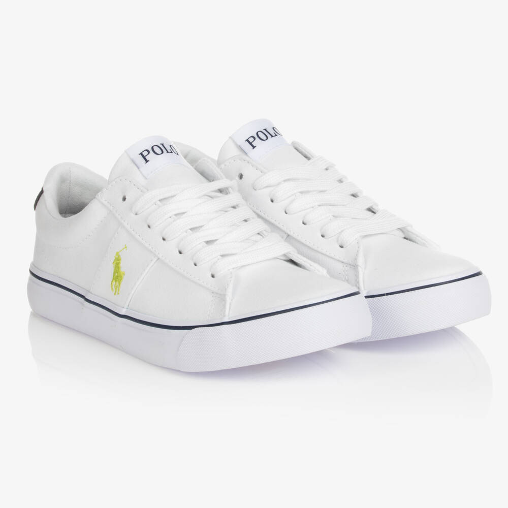 White canvas low-top trainers for boys and girls, by Polo Ralph Lauren. Lined with a padded textile insole, they have the signature green pony logo embroidered on the sides for a recognisable look. Fastening with laces on the front, they have a Polo logo badge on the tongue and the back of the rubber heel. The bottom of the soles are embossed with the brand's logo for a finishing designer touch.