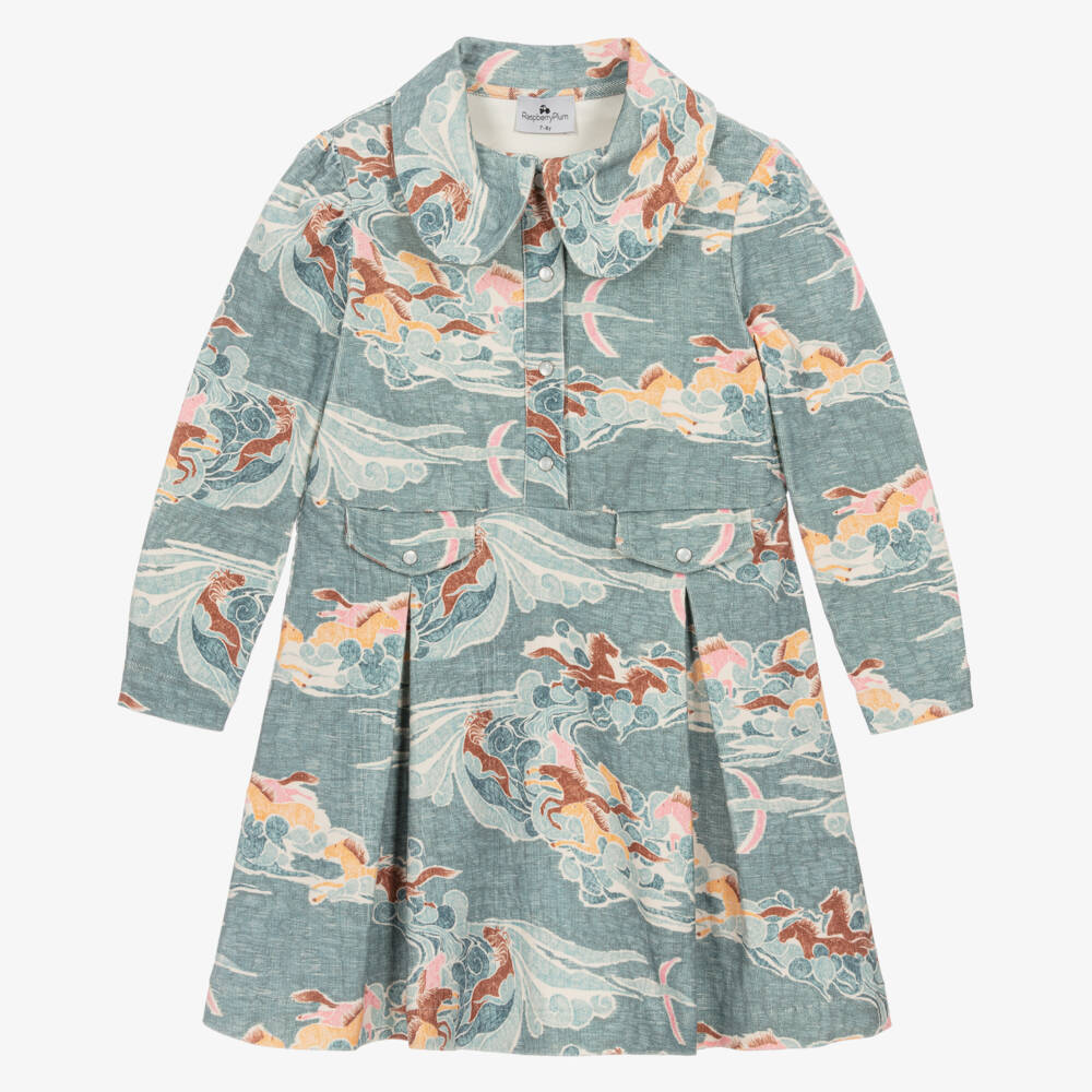 Blue shirt-style dress for girls by RaspberryPlum, made from a soft brushed cotton. It has a colourful and quirky horse and crescent moon design, with an oversized rounded collar for a retro look. Fully lined for comfort, it has front flap pockets with pearlised popper fastenings and matching poppers halfway down the bodice.
