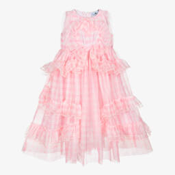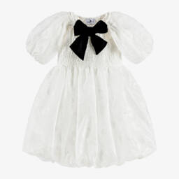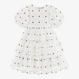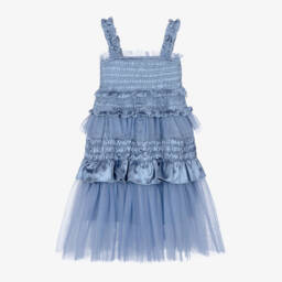 A beautiful blue dress for girls by RaspberryPlum, made in lightweight tulle with a soft voile lining. Ideal for parties, this stunning dress has a modern silhouette created from puff sleeves and a voluminous skirt. Charming tonal embroidered flowers give a pretty finish.