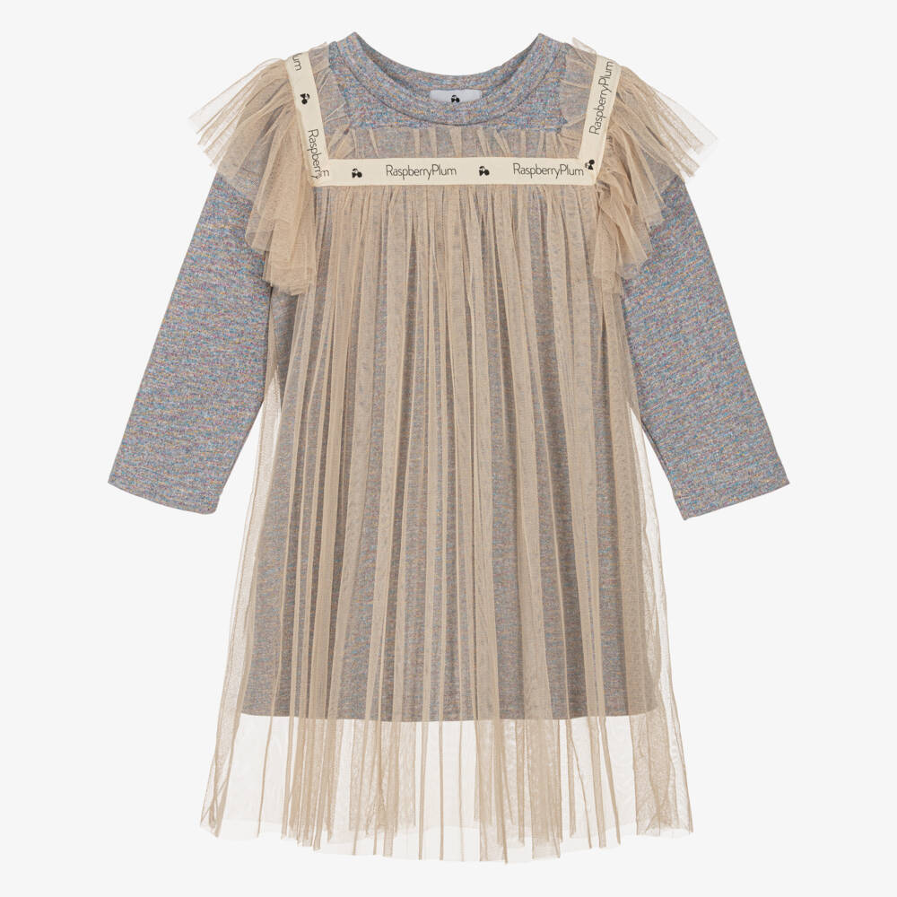 Grey marl dress for girls by RaspberryPlum, made in a soft cotton blend with a glittery yellow, blue and pink lurex weave. A unique design, this long-sleeved, jersey dress has a beige tulle overlay with branded tape trims on the bodice and shoulders. Designed to look like two pieces, the frill details on the upper body bring a traditional feel to this vintage-inspired silhouette.