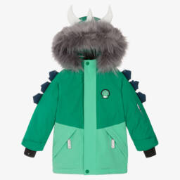 Зеленая лыжная куртка для мальчиков и девочек от Roarsome с забавным дизайном динозавра, украшенная шипами и рогами. Идеально подходит для дня на горных склонах, полностью водонепроницаемая с проклеенными швами и водозащитными молниями. Этот теплый и уютный стиль имеет мягкую термоизоляцию и съемный капюшон с отстегивающейся серой искусственной меховой отделкой. Для дополнительной защиты от холода и снега предусмотрена снежная юбка и регулируемые манжеты с внутренними гетрами. Есть карманы на молнии спереди и удобный карман для ски-пасса на одном рукаве.