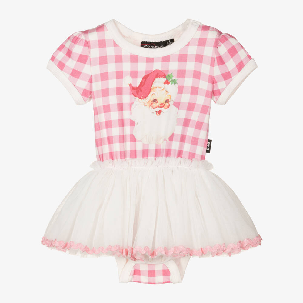 An adorable dress for baby girls by Rock Your Baby, printed with a pink and white gingham pattern. Inspired by the festive season, it has a retro Santa Claus design on the chest and a tulle tutu skirt overlay with a pretty pink trim. Made from soft cotton jersey, there are practical popper fastenings on one shoulder and the attached knickers for easy dressing.