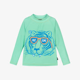 Boys green sun protective swim top by Rock Your Baby, featuring a cool, blue tiger graphic. Ideal for sunny days out at the beach or pool, it is made in silky, stretchy UPF50+ fabric, with long sleeves and a high neckline. Easy to wear, it simply slips on over the head.