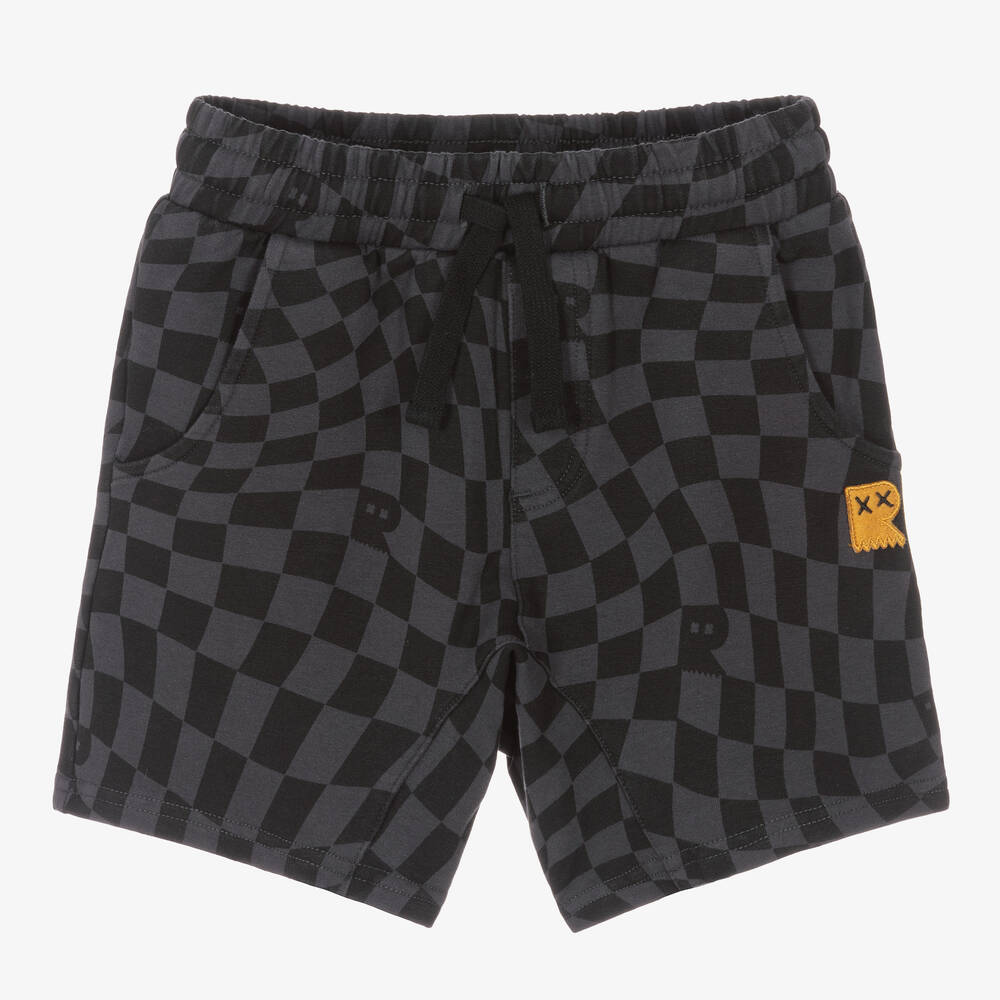 Casual style for boys by Rock Your Baby, with these black and grey check shorts. Made in comfortable cotton jersey, they have an elasticated waistband with an adjustable drawstring tie and three useful pockets. For a branded finish, they have logo appliqués n the front and back.