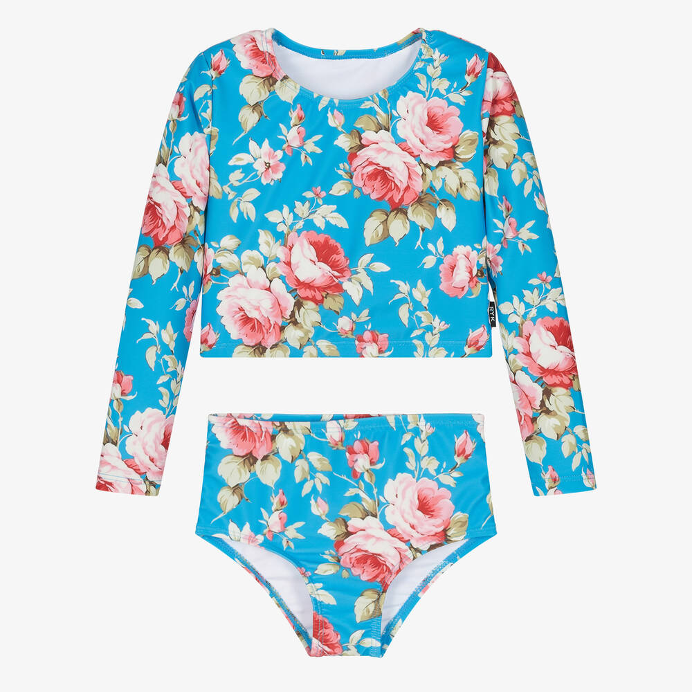 A lovely blue tankini for girls by Rock Your Baby, made in silky smooth fabric with UPF 50+. It is patterned with beautiful florals in pink and green and fully lined for comfort. The long-sleeved top has a rounded neckline and the bikini bottoms are gently elasticated for a comfortable fit. This product contains recycled fibres.