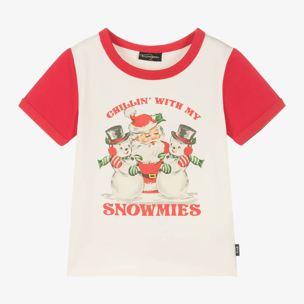 Ideal for festive wear, this ivory T-shirt for boys and girls by Rock Your Baby, is designed in a retro ringer style with contrasting red trim. Made in comfortable cotton jersey, it has a vintage Santa and snowmen print and the words, 'Chillin' with my Snowmies'.