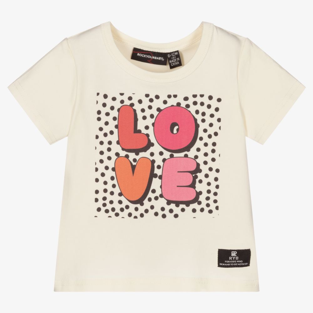 Little girls ivory T-shirt by Rock Your Baby, made in soft and stretchy cotton jersey. It has a red, pink and black dot 'Love' print on the chest and a logo badge on the hemline.