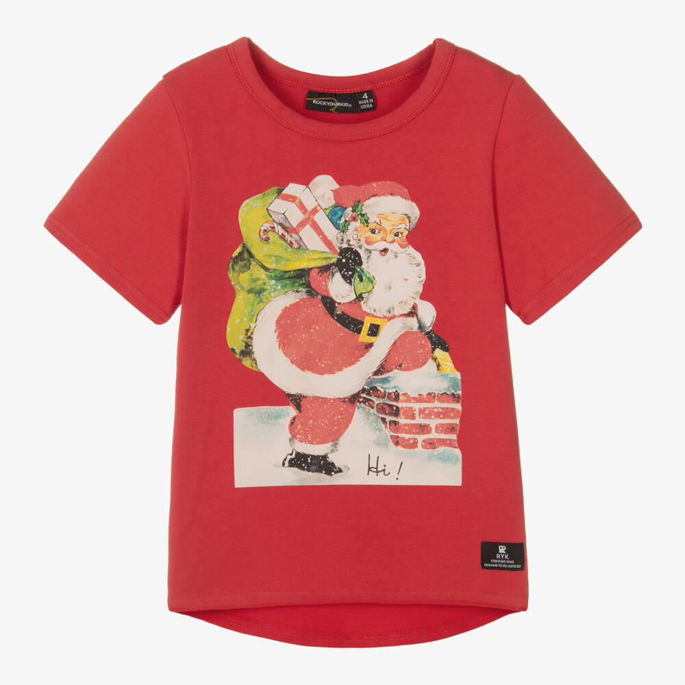 Red T-shirt for boys and girls by Rock Your Baby, made in soft and stretchy cotton jersey. It has a colourful retro Santa print on the front and a stylish dipped hem. This fun top has a black logo patch on the front and a small crew neckline.