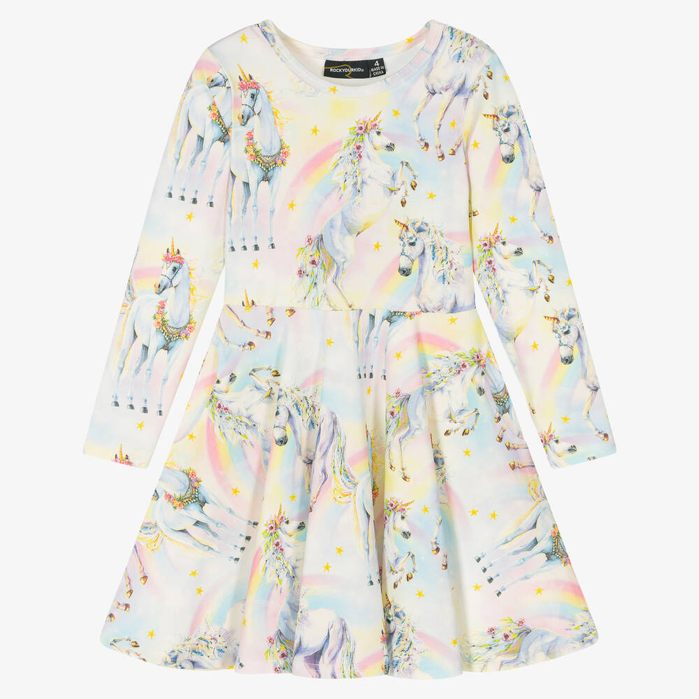 A fun and colourful dress for girls by Rock Your Baby. Made in stretchy, lightweight cotton jersey, it has majestic unicorn, star and rainbow prints in pastel pink, blue, purple and yellow. Finishing just below the knee, this long-sleeved skater dress has a crew neckline, long sleeves and useful concealed front pockets. Comfortable and easy to wear, it slips on over the head.