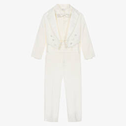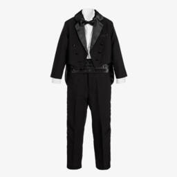 Boys black special occasion tuxedo suit by Romano. This elegant suit comprises a tailcoat jacket, trousers, white pintuck shirt, bow tie, and cummerbund. The jacket has satin lapels and buttons and the trousers have a comfortable elasticated waistband and a satin stripe at each side for a stylish finish.