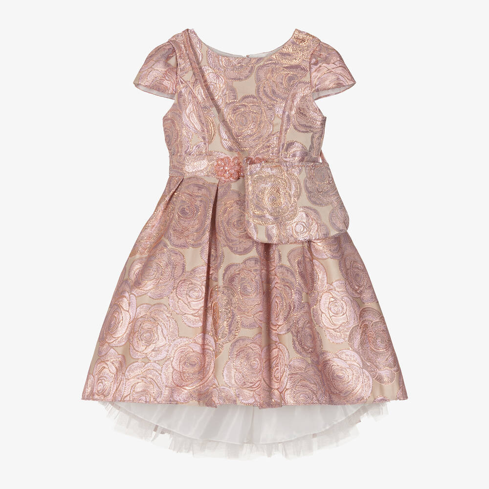A gorgeous pink dress set for girls by Romano, made from beautiful rose-patterned brocade. In a pretty fit-and-flare style, it has capped sleeves, and a full pleated skirt with a charming high-low hem and tulle underlayers for extra volume. Fastening with a concealed zip, it has a jewel-embellished sash belt that ties into a pretty bow on the back. A lovely coordinating bag is included with older sizes.