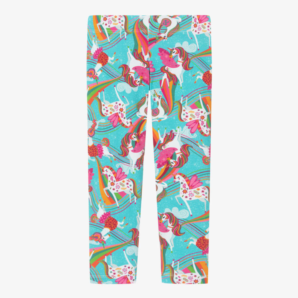 Fun turquoise blue cotton leggings for girls by Rosalita Señoritas, printed with colourful unicorns, rainbows, and clouds. They are made out of a soft and breathable light-weight jersey, together with an elasticated waist for extra comfort.
