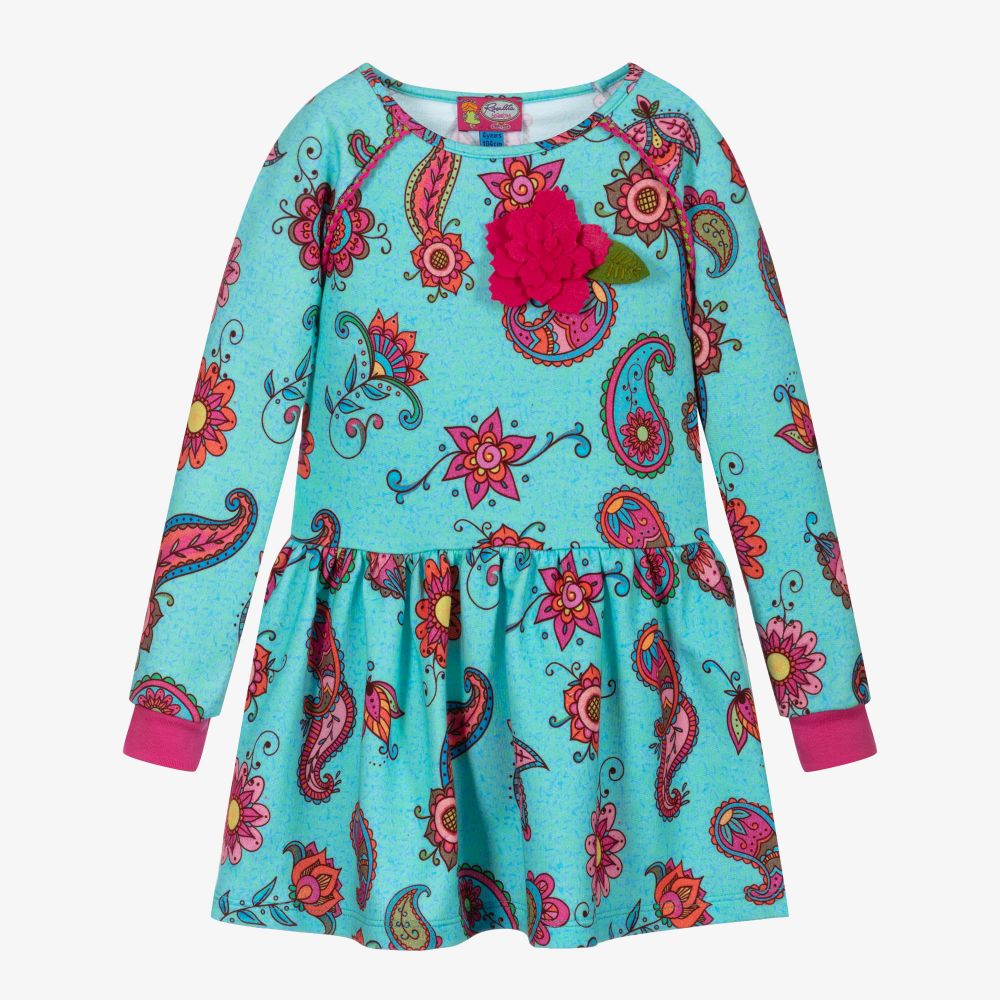 Aqua blue dress for girls, by Rosalita Senoritas. Made from soft cotton jersey, it has a pretty pink abstract floral print with pink ribbed cuffs, and a gorgeous pink appliqué on the front.