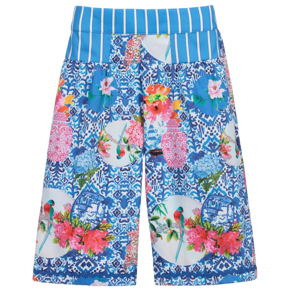 Girls wide-leg cropped trousers by Rosalita Senoritas, made in lightweight cotton poplin. They have a colourful floral print on a blue and white background, and an elasticated waistband.