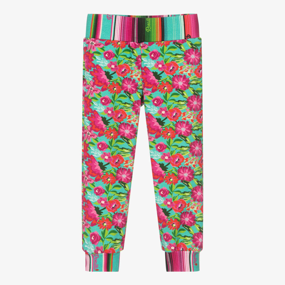 Pretty turquoise blue viscose joggers for girls, by Rosalita Señoritas, with a vibrant floral pattern that incorporates a medley of fuchsia pinks, greens, and reds. Comfortable to wear, they are made from a soft and stretchy jersey fabric, with contrasting elasticated ankle cuffs and waistband in a complementary striped print.
