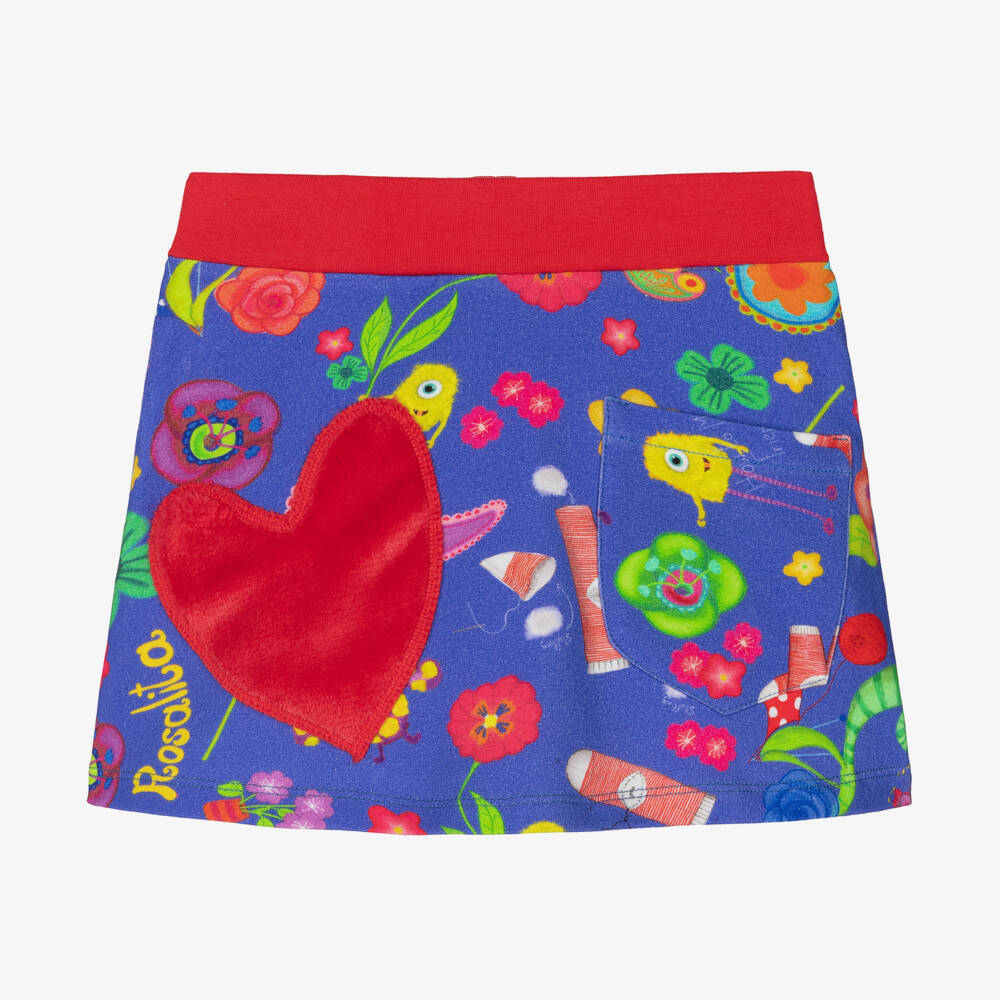 Quirky blue and red skirt for girls by Rosalita Señoritas, made in soft cotton jersey for casual comfort. A plush red heart appliqué adds fun texture to the front, and is positioned next to a patch pocket. It has a colourful bug and flower print to capture your child's imagination.