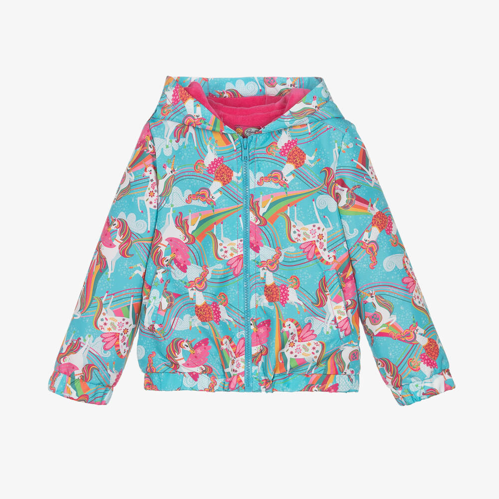 Sweet blue jacket for girls by Spanish brand Rosalita Señoritas, patterned with colourful unicorns and rainbows. Lightweight and silky, it has a warm hood, elasticated trims and a soft, pink velour lining for extra cosiness. On the front are two useful pockets and an exposed zip fastening.