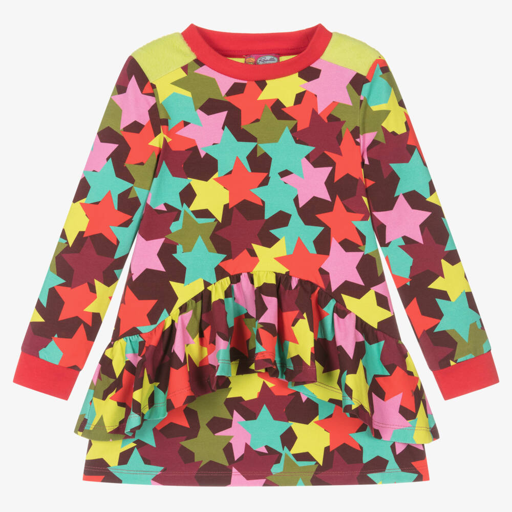 Burgundy red cotton dress for girls by Rosalita Señoritas, with a bright, multi-coloured star pattern. Made from soft, stretchy jersey for a comfortable wear, it has green fluffy trims and a vibrant red neckline for a fun look.