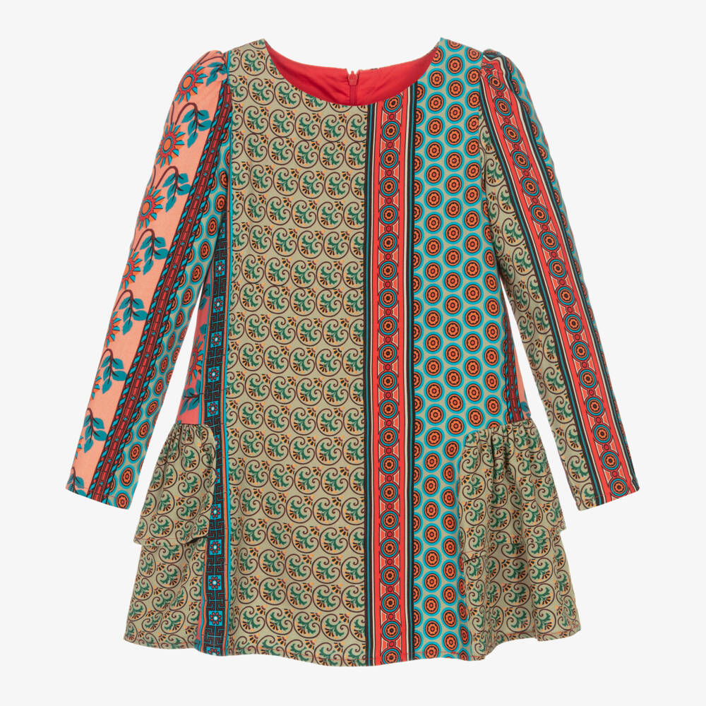Eye-catching dress for girls by Spanish brand Rosalita Señoritas, with a vibrant circular and floral print in green, red, pink and blue. Made in soft viscose twill, it has feminine, puffed sleeves and a skirt that has gathered tiers on the sides and back. Fully lined in soft, red cotton, it fastens with a zip around the back.