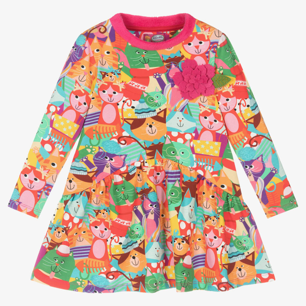 Bright multi-coloured cotton dress for girls by Rosalita Señoritas, made from soft, stretchy jersey. Printed with a cute, all-over cat design, this dress has a pink fluffy trim at the neckline and a pink felt flower embellishment on the chest. The deep frilled skirt is curved at the waistline, enhancing the feminine A-line silhouette.