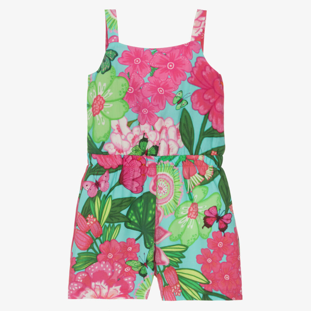 Vibrant and eye-catching, this cotton playsuit for girls is by Spanish brand Rosalita Senoritas. Made in soft twill, it has a beautiful pink and green floral pattern on a turquoise blue background. The waistband is elasticated and there is a cut out section around the back with a pretty fixed bow above. Easy to wear, it simply pulls up.