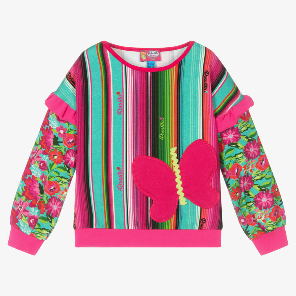 Make a statement in this super fun and playful girl's sweatshirt by Spanish brand Rosalita Señoritas. Made in a soft viscose jersey, the striped sweatshirt has a large pink butterfly appliqué on the front, and a complementary floral pattern on the sleeves. The hem and cuffs are lightly elasticated for comfort and there are pretty pink frills on the shoulders for a girly look.