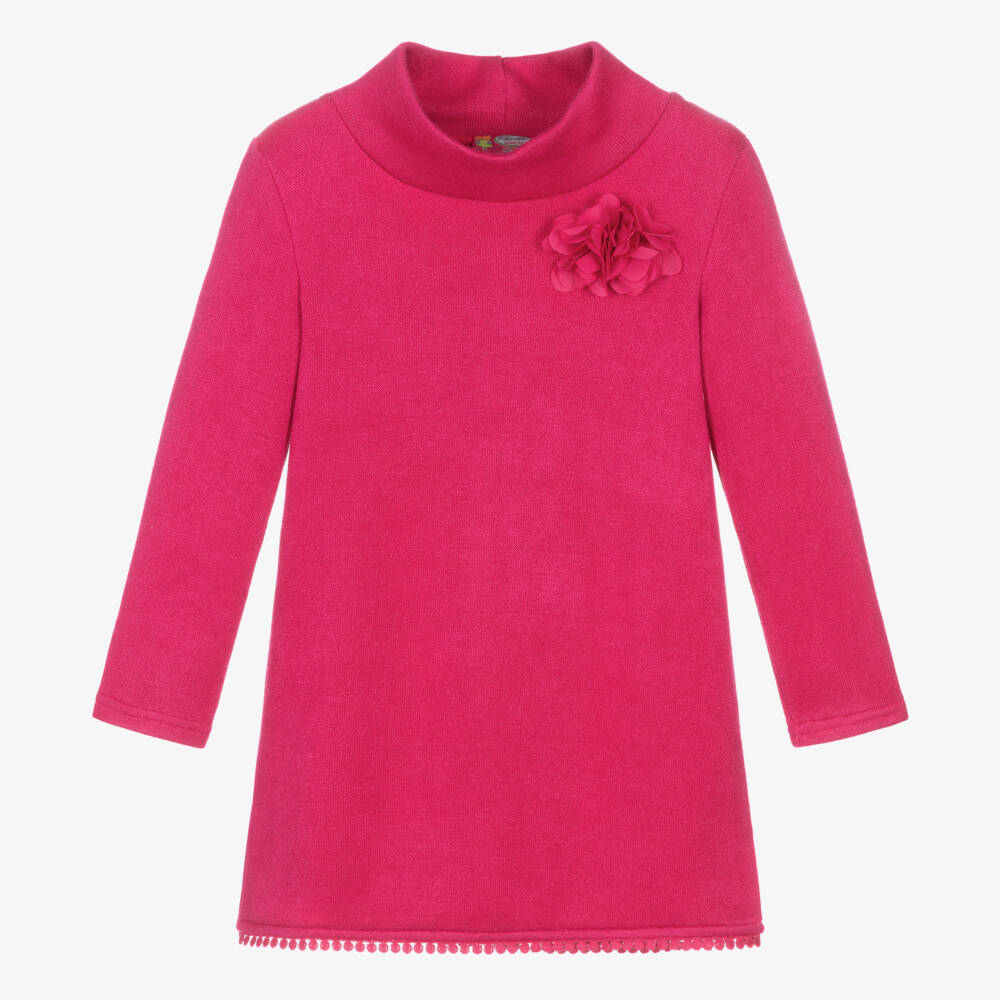 Bright pink dress for girls by Spanish brand Rosalita Señoritas, knitted in a super soft, viscose blend. It has a wide roll neck and and a chiffon flower appliqué on the chest, with a trim on the hemline of embroidered circles. Easy to wear, it simply pulls on over the head.