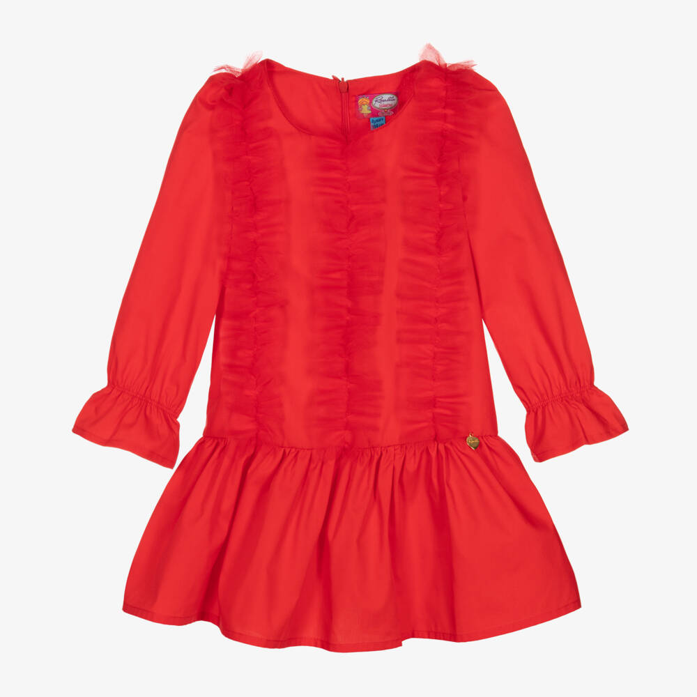 Lovely red dress for girls by Rosalita Señoritas, woven in a lightweight cotton blend. The sleeves have an elasticated trim creating a fluted look and the bodice is decorated with delicate tulle ruffles. It has a neat zip on the back for easy dressing, and a shiny gold heart charm on the waist for a pretty touch.