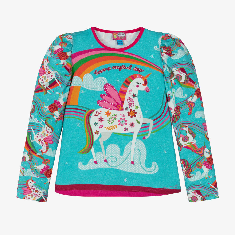 Turquoise blue top for girls by Rosalita Señoritas, printed in bright colours for a fun look. Whimsical unicorns and colourful rainbows add a playful touch to this everyday style. It has gently puffed sleeves for a girly finish.