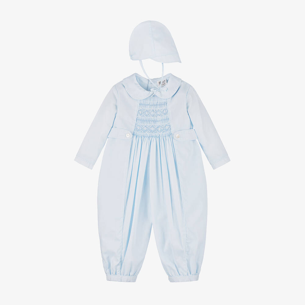 Traditionally styled, pale blue babysuit and hat set for boys by Sarah Louise. This charming set is made in soft, lightweight cotton-blend poplin, beautifully hand-smocked and hand-embroidered with tonal blue and white detaiing. The long-sleeved romper has a rounded collar, decorative side tabs, cuffed legs and button fastenings. The matching cap is elasticated on the back and has a detachable strap to fasten under the chin.