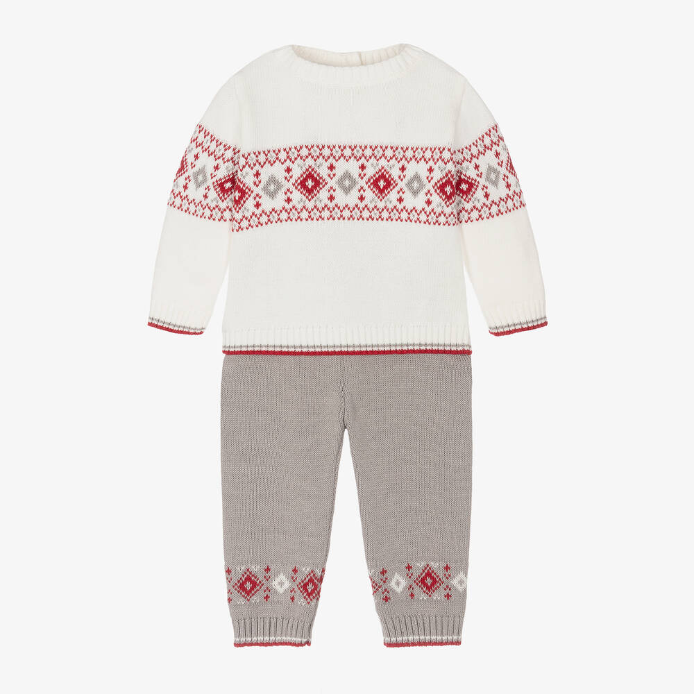Charming ivory and grey cotton knit trouser set for little boys from Sarah Louise. A lovely addition to his festive wardrobe, the coordinating pieces have a classic red and grey Fair Isle design. Soft and cosy with ribbed trims, the jumper buttons up neatly on the back while the trousers simply pull up.