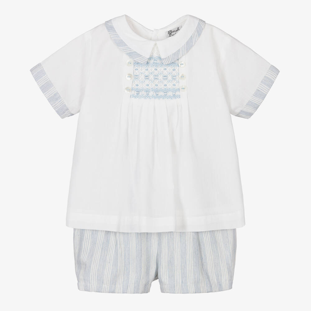 Sweet ivory and pale blue cotton-blend shorts set for little boys by traditional British brand Sarah Louise. The ivory shirt has a lovely hand-embroidered and hand-smocked panel on the front, with decorative, pearlised buttons and striped, pale blue trims on the collar and cuffs. It fastens on the back with buttons. The coordinating pale blue-striped, lined shorts have decorative buttons on the front, with an elasticated waistband and cuffs for comfort.