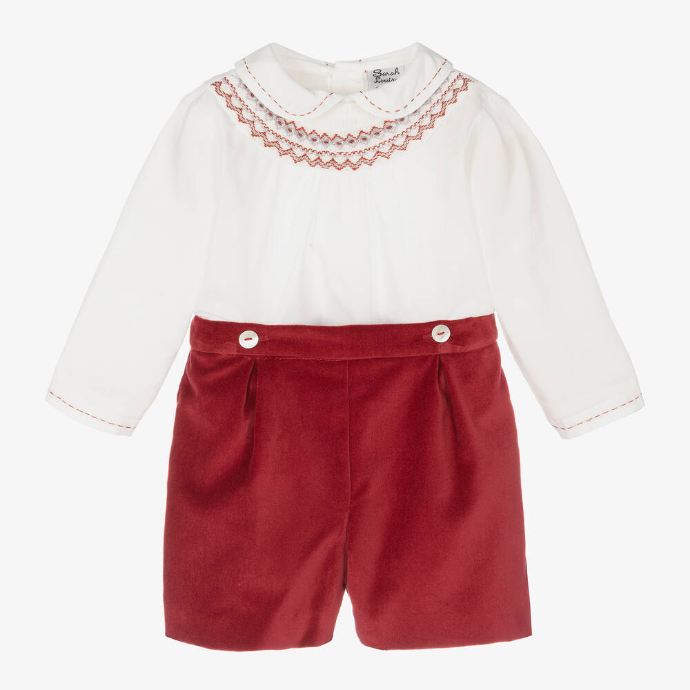 Traditionally styled ivory and red buster suit for little boys by British brand Sarah Louise. Made in a comfortable cotton blend, the lightweight shirt is beautifully hand-smocked and hand-embroidered. The smart velvet shorts attach to the top with buttons for a neat, tucked-in finish and they have an adjustable waistband for a good fit.