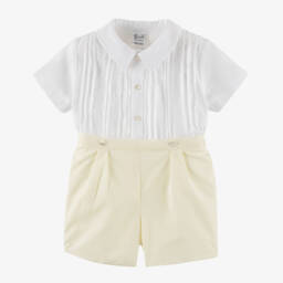 A traditional white shirt and pastel yellow shorts set for little boys by Sarah Louise, made in a soft cotton blend. The lightweight shirt has smart pintuck pleats and hand-embroidered detail, with pearlescent button fastenings. It tucks into the shorts, and secures with buttons on the front and back, keeping it neatly in place. They are pleated on the front, elasticated on the back and designed with an adjustable waistband for a comfortable fit.