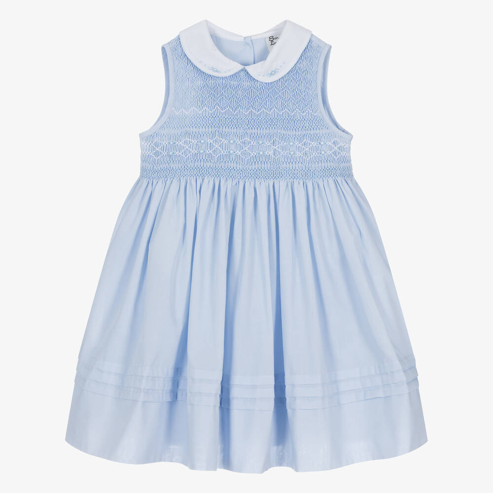 A pale blue dress for girls from Sarah Louise, made and lined in a cotton blend. Soft and lightweight, this traditional style has a white Peter Pan collar detailed with embroidered flowers and a beautifully hand-smocked and hand-embroidered bodice. It fastens with buttons and a sash which ties into a lovely bow on the back.