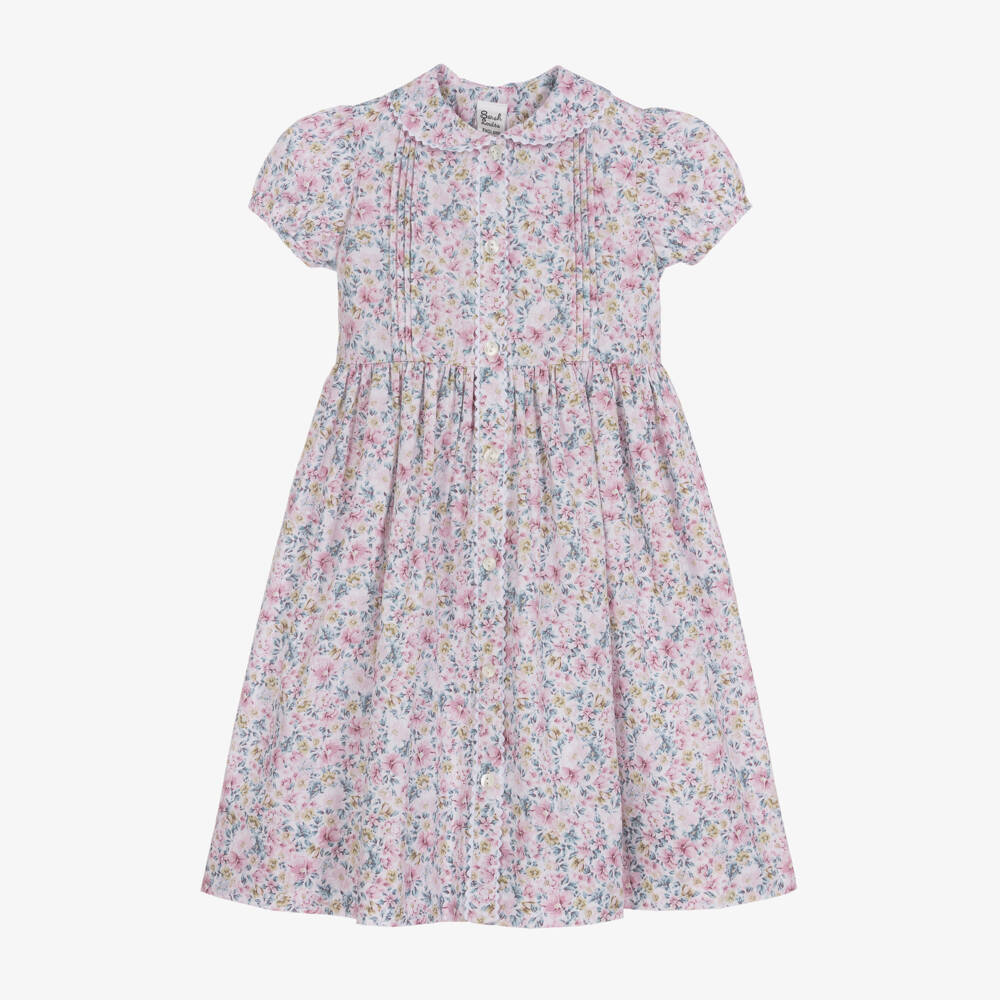 Exclusive to Childrensalon, this pretty pink floral print cotton blend dress for girls is by British brand Sarah Louise. Classically designed, it has a pretty rounded collar and puffed sleeves, with pin-tuck detailing on the bodice. Fully lined for comfort in a lightweight voile, it fastens at the front with decorative buttons and has an attached sash tie on the back.