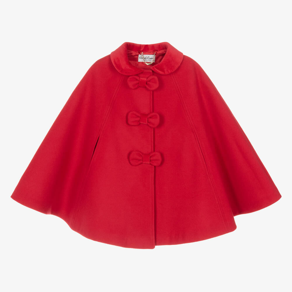 Gorgeous classic red cape for girls by British brand Sarah Louise, made in a soft, mid-weight, felted viscose blend. Traditionally styled, with openings for the arms on the front, it has a silky lining for comfortable wear. It has a velvet collar and button fastenings concealed behind pretty bows.