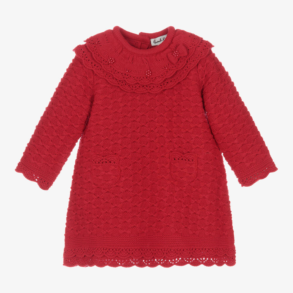 Younger girls pretty red dress by Sarah Louise, knitted in soft acrylic with a lovely all-over pattern. It has a knitted ruffle collar with little pearl decorations and a sweet bow detail. The collar, cuffs, hem and pockets have scalloped lace knit trim and there are button fastenings on the back.