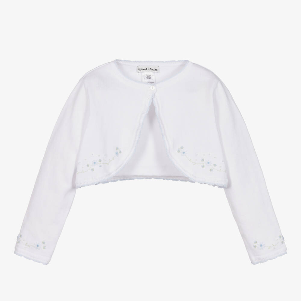 Adorable white bolero cardigan for girls by classic British brand Sarah Louise, knitted in soft cotton. It is delicately detailed with blue, scalloped trims, pretty, hand-embroidered flowers and pearl beads for a sweet finish. It fastens with a single button on the front.