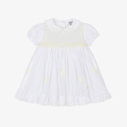 Очаровательное белое платье для маленьких девочек от Sarah Louise из прозрачной, легкой хлопковой вуали с красивыми оборками. Оно имеет изящный, вручную вышитый лиф и украшено нежными желтыми вышитыми бабочками и цветами. Застегивается на пуговицы сзади и имеет пояс для традиционного завершения. Двойная подкладка, одна из которых с тюлевой оборкой для дополнительного объема.