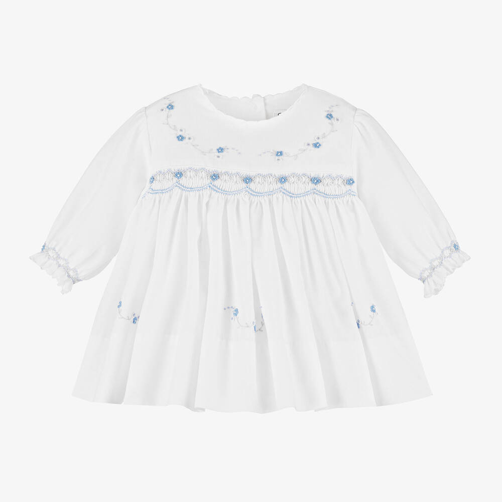 Очаровательное белое платье для девочек от Sarah Louise из мягкой хлопковой смеси с красивыми волнистыми краями. Эта традиционная модель с ручной присборенной вышивкой украшена светло-голубыми цветами и изящными прозрачными бусинами для особого акцента. Платье на подкладке для комфорта и застегивается сзади на перламутровые пуговицы.