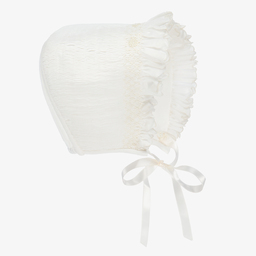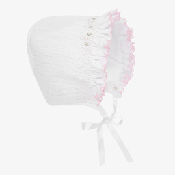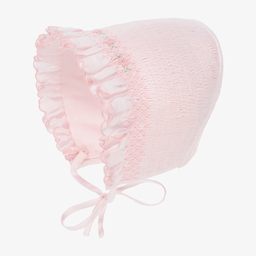 A traditional, hand-smocked pale pink bonnet for baby girls by Sarah Louise. Made and lined in soft polycotton with hand-embroidered flowers, it has a silky ribbon to tie under the chin.