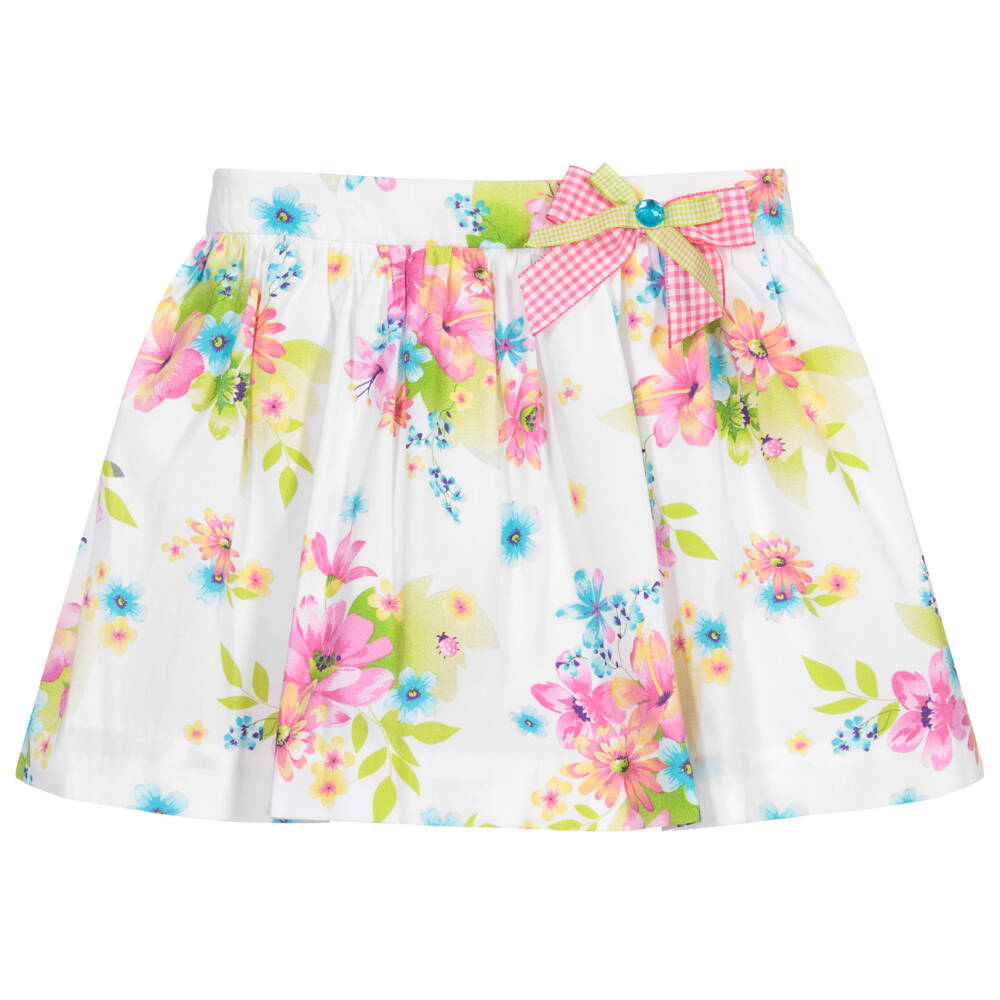 White skirt for girls by Sarah Louise, made in soft, lightweight cotton, with a colourful floral print. Fully lined and lightly gathered, it has pink and white and green and white gingham bows on the waistband. There is a side zip and useful adjustable waist.