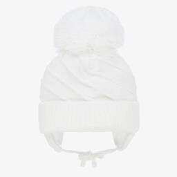 A pale pink winter hat for girls by Sätila of Sweden, made from a chunky knit with diagonal rib detailing. For a cute look, it has a giant pom-pom on top, a turned-up brim, and charming ear flaps with ties that fasten under the chin. It is partially lined in knitted cotton for additional warmth and comfort.