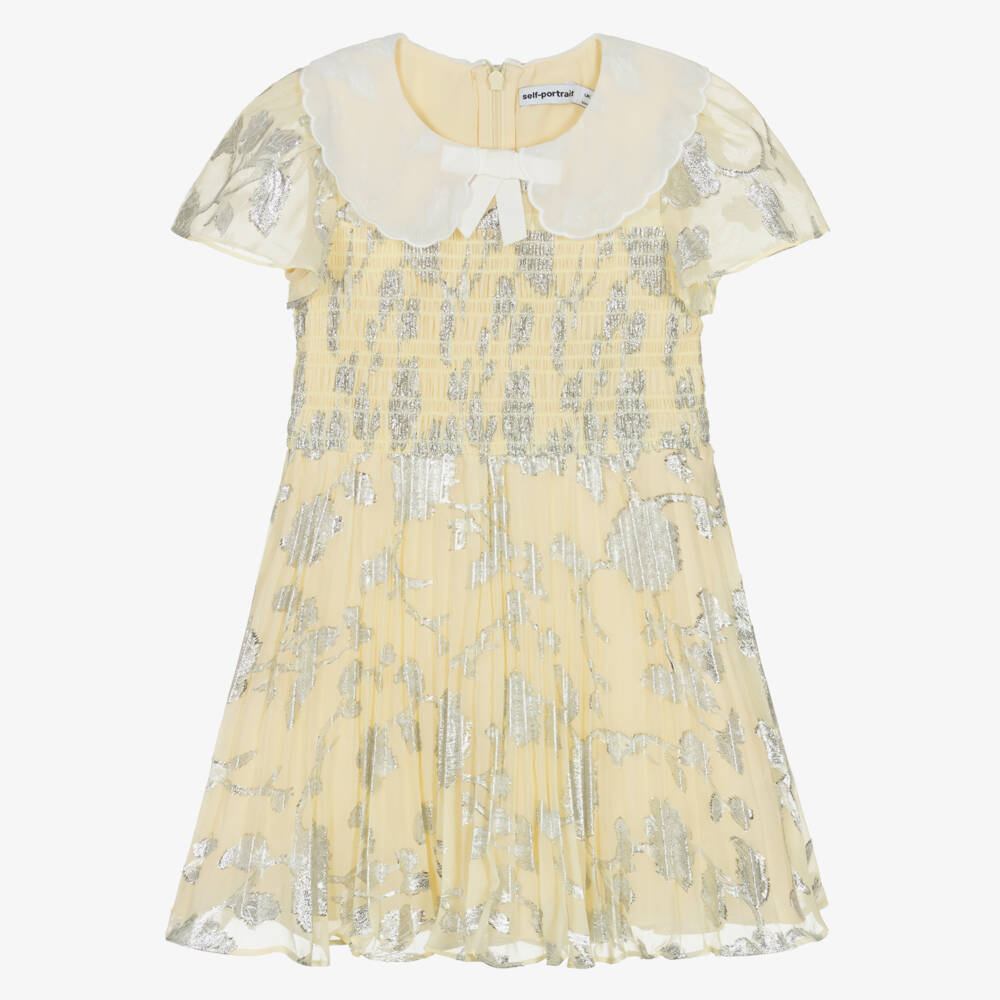 A lovely pale yellow dress for girls by Self-Portrait, made from soft and lightweight fabric. Designed with a shirred bodice, this feminine piece has a beautiful silver floral jacquard pattern. There is ivory grosgrain bow on the neckline and a contrasting white crêpe, scallop trimmed collar. The pleated skirt is elasticated on the waist and has a soft lining to ensure comfortable wear. The dress fastens on the back with a concealed zip.